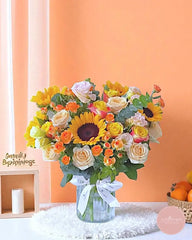 Bursting with vibrant energy, this joyful vase arrangement features bold sunflowers surrounded by cheerful peach and yellow roses, bright orange spray roses, and soft pink accents. Thoughtfully arranged in a clear glass vase, it’s a radiant expression of warmth and positivity.