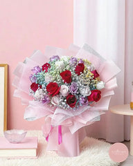 This vibrant arrangement showcases classic red, pink, lilac, and white roses, complemented by a cheerful spray of multicolored baby's breath. Wrapped in soft pastel pink with delicate mesh accents, it’s a joyful and eye-catching bouquet perfect for heartfelt surprises.