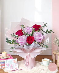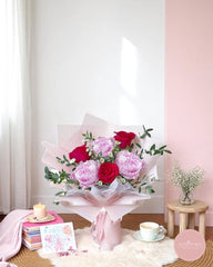 This lush bouquet showcases the captivating beauty of full-bloom pink peonies paired with bold red roses, delicately framed by fresh greenery and dainty filler flowers. The luxurious blend of textures and tones evokes timeless romance and heartfelt affection—ideal for anniversaries, celebrations, or simply to show you care.