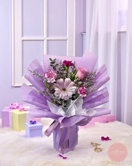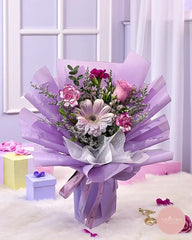 A charming blend of lilac gerbera, purple roses, and delicate carnations, wrapped in soft lavender hues that exude elegance and warmth. This bouquet captures the essence of affection and thoughtfulness, making it an ideal gift to celebrate birthdays, anniversaries, or simply to brighten someone’s day.
