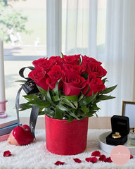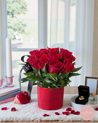 Rich and romantic, this arrangement showcases a lush cluster of velvety red roses nestled in glossy greenery, presented in a sparkling crimson hatbox-style pot and finished with a sleek black ribbon. Compact yet luxurious, it brings an elegant pop of red to any bedside table, work desk or dining setting.