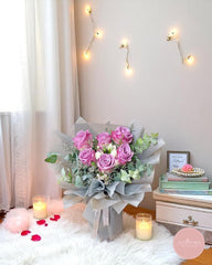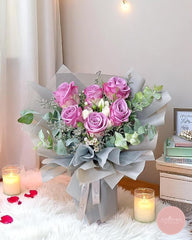 Elegant and enchanting, this bouquet features six lavender roses paired with soft white eustoma and lush eucalyptus accents. Wrapped in sophisticated grey-toned layers and finished with a satin ribbon, it’s a refined arrangement that speaks of grace, admiration, and mystery.