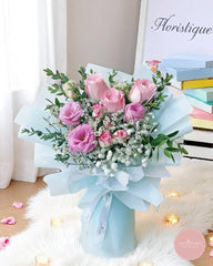This bouquet exudes serene elegance with its soft pink roses and delicate blossoms, nestled amidst lush greenery. Wrapped in pale blue paper and accented with a billowing light blue ribbon, it makes for a tranquil and sophisticated offering. A graceful choice from your trusted florist in Singapore, thoughtfully arranged for prompt flower delivery to any doorstep.
