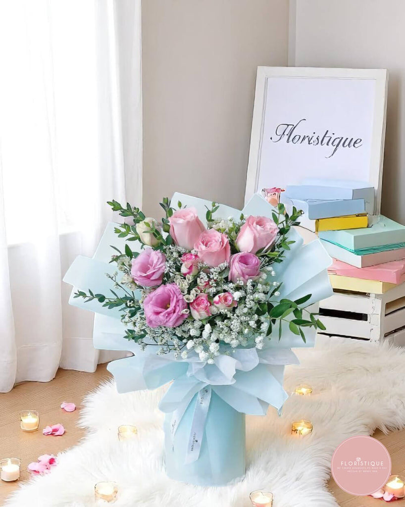This bouquet exudes serene elegance with its soft pink roses and delicate blossoms, nestled amidst lush greenery. Wrapped in pale blue paper and accented with a billowing light blue ribbon, it makes for a tranquil and sophisticated offering. A graceful choice from your trusted florist in Singapore, thoughtfully arranged for prompt flower delivery to any doorstep.