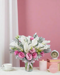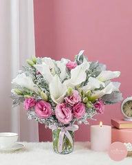 This graceful vase arrangement features the timeless elegance of white calla lilies paired with soft pink lisianthus, dusty miller, and delicate fillers. The blend of whites and blush tones creates a soothing, refined look—perfect for expressing admiration, love, or sympathy.
