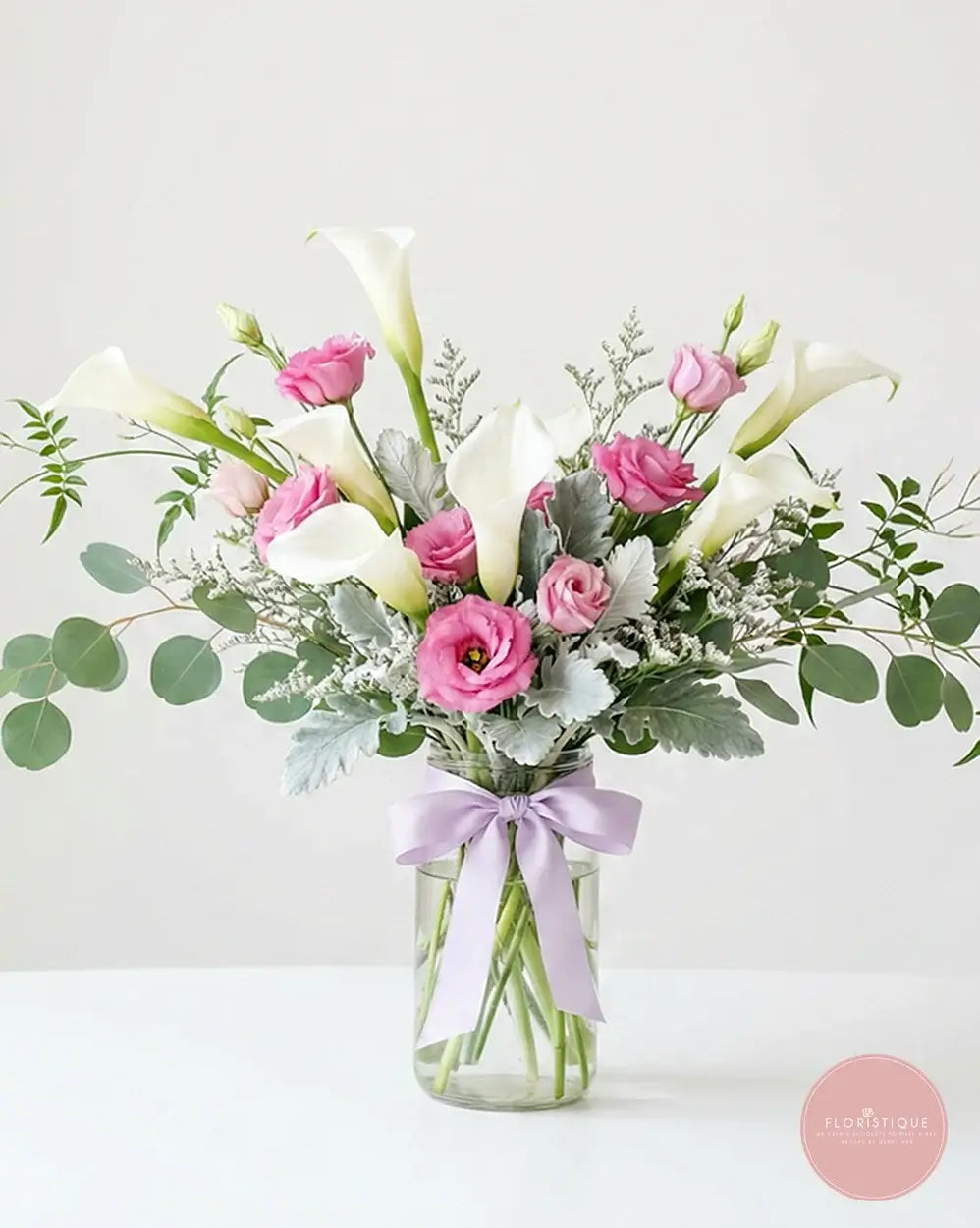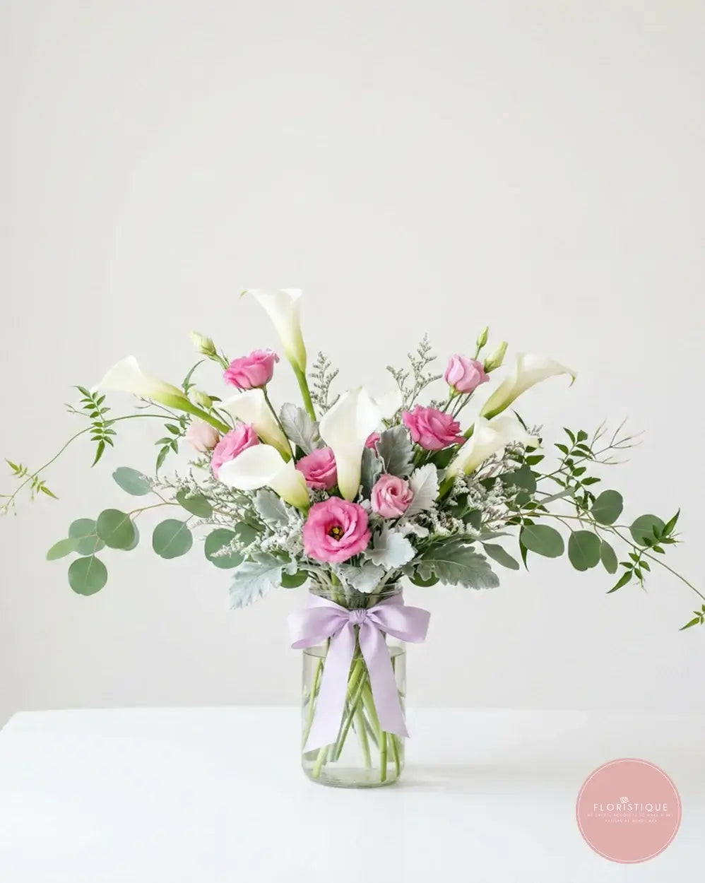 This refined arrangement features elegant white calla lilies paired with soft blush pink blooms, creating a graceful and modern aesthetic. Accented with silvery dusty miller foliage, delicate fillers, and fresh eucalyptus, the bouquet offers a beautiful balance of texture and sophistication.