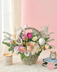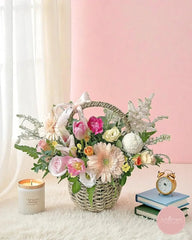 This charming flower basket bursts with soft pastel tulips, blush gerberas, creamy roses, and elegant chrysanthemums, all artfully arranged with lush greenery in a rustic woven basket. A gentle and joyful gift perfect for brightening someone’s day.