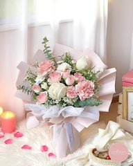 This graceful arrangement blends delicate cream roses with soft peach carnations and blush spray roses, nestled among white fillers and sprigs of eucalyptus. Wrapped in gentle pastel paper, the bouquet radiates charm and serenity.