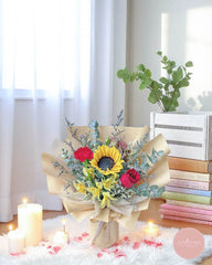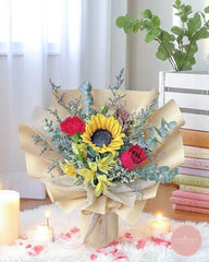 This bouquet offers a striking mix of textures and colors, centered around a vibrant sunflower. Crimson roses and a rich red carnation lend a touch of classic romance, while yellow alstroemeria and assorted greenery provide a lively backdrop.