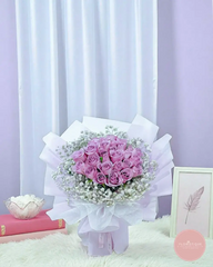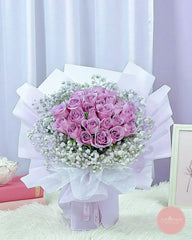 This enchanting hand bouquet features a generous cluster of elegant lavender roses, encircled by delicate clouds of baby's breath and wrapped in soft lilac hues. Graceful and captivating, it conveys admiration, enchantment, and love at first sight.