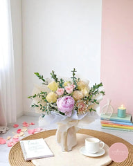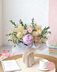 This exquisite floral arrangement is a symphony of elegance and softness, featuring a stunning pink peony taking center stage. It is surrounded by an array of delicately hued roses in shades of gentle yellow, tender pink, and creamy peach, each bloom perfectly nestled among whispers of baby's breath and verdant foliage.
