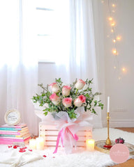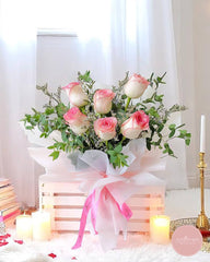 Gracefully elegant, this bouquet showcases six soft cream roses kissed with blush pink tips, delicately framed by lush greenery and misty fillers. Wrapped in layers of white and blush with a satin pink ribbon, it radiates femininity and timeless charm.