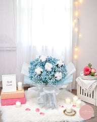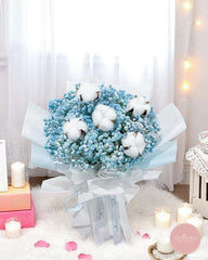 Soft as a cloud and serene as a clear sky, this bouquet features a dreamy mix of blue baby’s breath paired with fluffy cotton blooms. Wrapped in creamy white layers and finished with a satin ribbon, it’s a gentle and comforting arrangement that evokes calm and purity.