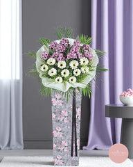 A graceful arrangement of soft purple and white chrysanthemums, delicately wrapped and accented with lush palms, this condolence flower stand radiates quiet strength and sympathy. Thoughtfully designed to bring solace and pay tribute with dignity.