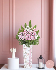 This heartfelt arrangement features serene tones of pink gerberas, white chrysanthemums, and lilac-petaled daisies, nestled among monstera leaves and elegant tropical greens. A soft and comforting tribute to honour a cherished life with warmth and dignity.