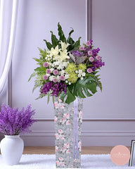 A graceful arrangement of purple statice, cream lilies, and white chrysanthemums, beautifully balanced with lush greens and elegant textures. This serene condolence stand conveys your deepest sympathies with poise and respect.