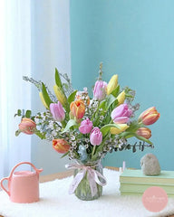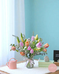 This cheerful vase arrangement features a delightful mix of tulips in soft pink, sunny orange, and lavender tones, paired with blooming lilies and sprigs of eucalyptus. The vibrant colours and elegant form of the tulips create a refreshing and uplifting design.