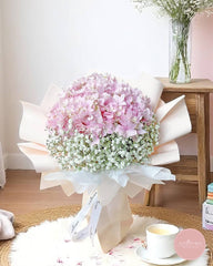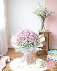 Soft and dreamy, this bouquet features a charming dome of pastel pink hydrangeas paired with fluffy white baby's breath. Wrapped in elegant white and blush-toned layers, it's the perfect gift to express love, appreciation, or gentle encouragement.