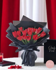 A luxurious expression of love and passion, this bouquet features 18 radiant red tulips elegantly wrapped in glossy black paper and tied with matching ribbon. Sophisticated and striking, this floral arrangement is perfect for grand romantic gestures, anniversaries, or making an unforgettable statement.