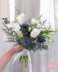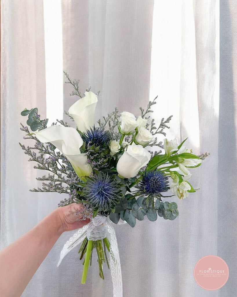 This elegant bouquet features pristine white calla lilies, delicate roses, and striking blue thistles, accented with lush greenery and soft lavender sprigs. Carefully tied with lace ribbon, it exudes a timeless charm, perfect for weddings or special occasions, radiating sophistication and natural beauty.