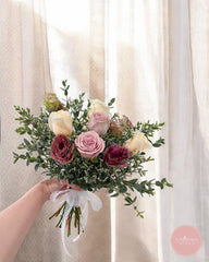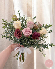 This romantic hand bouquet features a stunning combination of blush pink and cream roses, accented with deep mauve blooms and lush greenery. Complemented by delicate white fillers and tied with an elegant lace ribbon, it embodies timeless elegance, perfect for weddings or special celebrations.