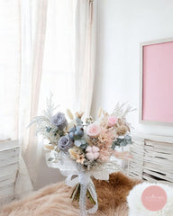 This elegant preserved and dried flower bridal bouquet features soft blush and lilac roses, fluffy cotton blooms, and airy pampas accents. Delicate foliage and rustic textures come together in a romantic harmony, making it a timeless keepsake for your special day. A sophisticated creation from your trusted florist in Singapore, complete with free flower delivery to ensure your wedding moments remain unforgettable.