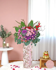 Bold meets beautiful in this elegant grand opening flower stand, featuring a graceful blend of pink gerberas, purple statice, lush roses, lilies, and a striking ornamental cabbage. Framed with birds of paradise, tropical leaves, and eucalyptus, all nestled in a floral-patterned stand with soft pink ribbon, it conveys strength, grace, and celebration.