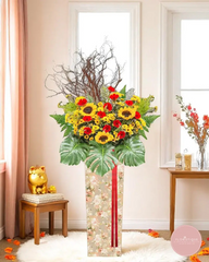 Radiating warmth and success, this grand opening flower stand features a joyful arrangement of sunflowers, red gerberas, yellow blooms, and fresh greenery, accented with artistic curly willow branches. Set in a floral-patterned stand and finished with a bold red ribbon, it embodies brightness, growth, and celebration.