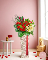 Vibrant and full of life, this grand opening flower stand features a bold arrangement of fiery red gerberas, yellow roses, and exotic ginger flowers. Accented with fresh foliage, curly twigs, and nestled in a romantic floral-patterned stand with a rich red ribbon, this design exudes energy, enthusiasm, and success.