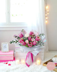 A delicate blend of pink-and-white variegated tulips, soft blush spray roses, and silvery eucalyptus, artfully arranged in iridescent pastel wrap with a flowing pink ribbon. Each stem is carefully hand-selected to ensure lasting freshness and a graceful silhouette. The gentle mix of rosy hues and luxe foliage creates a romantic, modern bouquet—perfect for birthdays, anniversaries, or simply to say “you’re in my thoughts.”