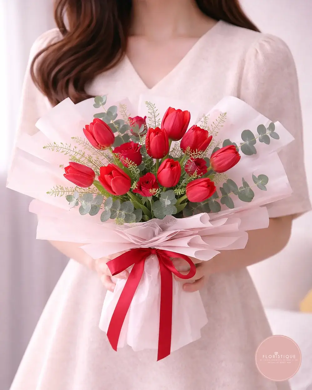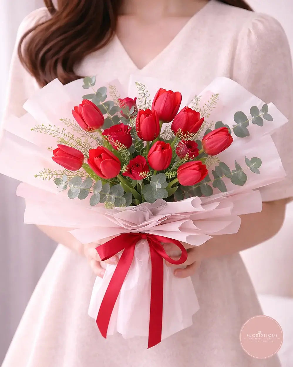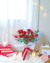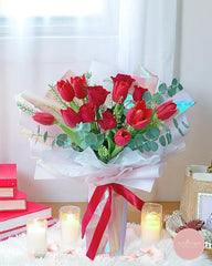 A passionate hand-tied arrangement featuring vibrant red tulips and rich crimson spray roses, artfully complemented by silvery eucalyptus and delicate fillers. Wrapped in layers of soft pink and iridescent cellophane and finished with a duo of coordinating ribbons, this bouquet exudes romance and modern elegance—perfect for anniversaries, Valentine’s Day, or any occasion when words alone aren’t enough.
