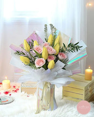 Embrace the warmth of early morning light with this uplifting hand-tied arrangement featuring sunny yellow Asiatic lilies, soft blush spray roses, and delicate white stock blooms, all artfully nestled in silvery eucalyptus and verdant foliage. Each stem is selected for its vibrant color and graceful form, creating a harmonious display that brings joy and optimism to any occasion.