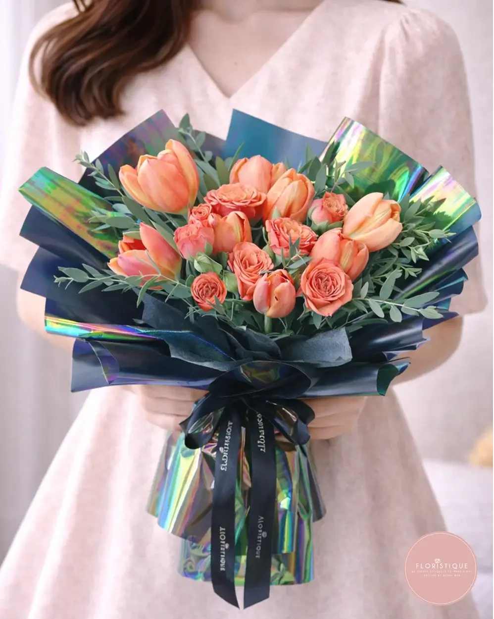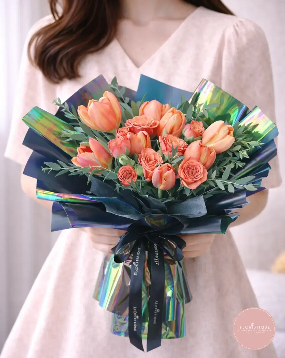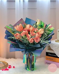 A stunning showcase of vibrant orange tulips and coral spray roses, artfully nestled among lush eucalyptus and foliage. Each bloom is hand-selected for its radiant color and long-lasting freshness, then wrapped in striking holographic and deep navy paper for a contemporary twist. This bold arrangement brings warmth and modern flair—perfect for making a statement at birthdays, congratulations, or corporate gifts.