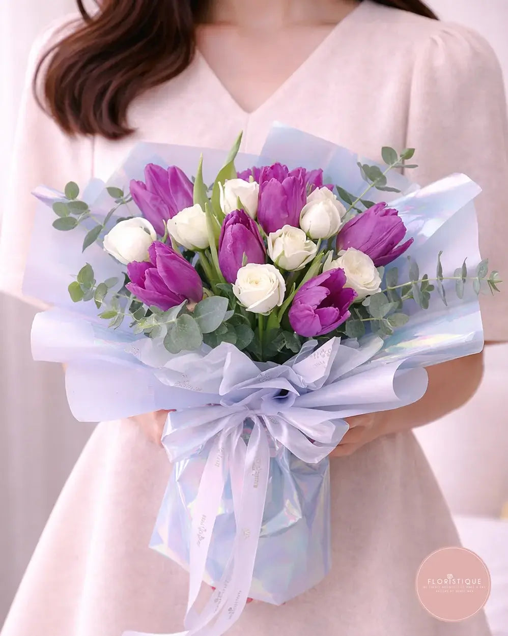 A serene hand-tied mix of deep lavender tulips and white spray roses, artfully nestled among silvery eucalyptus and airy fillers. Wrapped in soft purple iridescent paper with iridescent ribbon accents, this bouquet radiates calm elegance and modern charm—perfect for gifting on birthdays, graduations, or simply to brighten a loved one’s day.