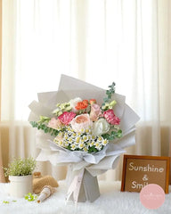 Bursting with charm, this delightful bouquet features cheerful chamomile blooms, coral and blush roses, and vibrant two-tone carnations, accented with fresh greenery and wrapped in soft ivory paper. A refreshing arrangement perfect for birthdays, thank-you gifts, or to simply uplift someone's day.