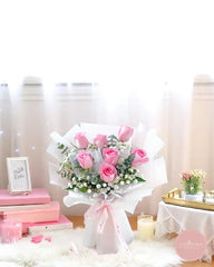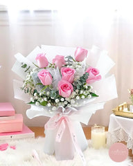 A graceful hand-tied bouquet featuring seven long-stemmed pink roses nestled in a cloud of delicate baby’s breath and creamy white lisianthus, all accented with silvery eucalyptus. Each bloom is hand-selected for its velvety petals and lasting freshness, creating an enchanting display that radiates romance and tenderness—perfect for anniversaries, birthdays, or a heartfelt surprise.