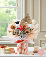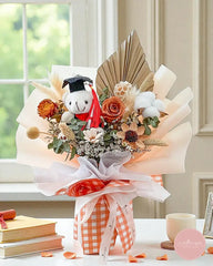 Celebrate academic milestones with this rustic-chic preserved flower bouquet, featuring warm-toned blooms, textured fillers, and a charming graduation bear nestled among cotton, sola flowers, and a golden palm leaf. Wrapped in soft peach and gingham accents, this long-lasting bouquet adds a touch of elegance and joy to any graduation moment.