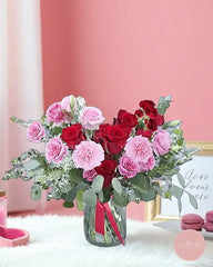 A romantic blend of rich red roses and soft pink carnations, beautifully arranged in a clear glass vase with lush greenery. This elegant design exudes warmth and affection, perfect for anniversaries, proposals, or heartfelt surprises.