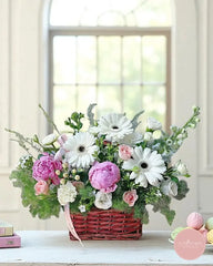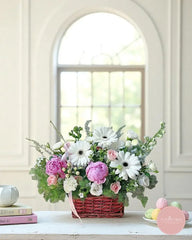 Fresh, refined, and delicately radiant — Elegant Peony Gerbera Basket features graceful white gerberas, soft pink peonies, spray roses, carnations, and lush foliage, beautifully set in a rustic red woven basket. With its soft pastels and clean whites, this arrangement brings a sense of peace, purity, and celebration.