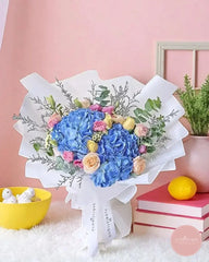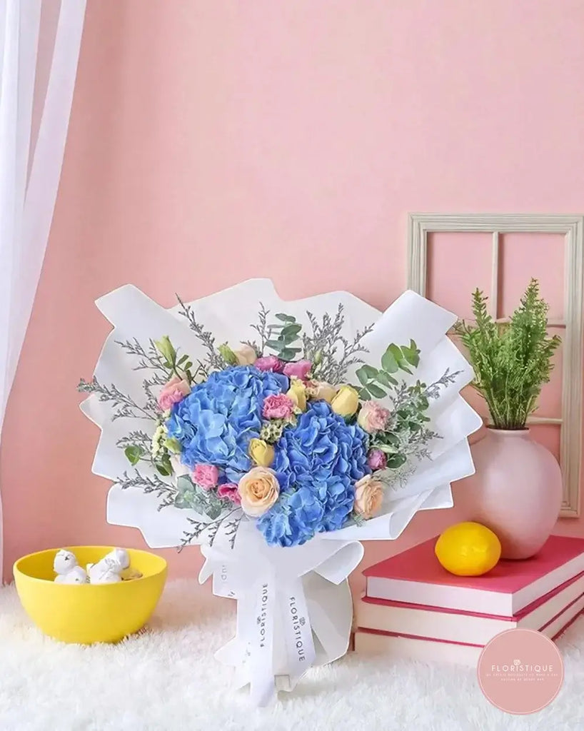 A graceful composition featuring lush blue hydrangeas as the centerpiece, surrounded by pastel roses and spray carnations for a soft, dreamy touch. Wrapped in elegant white and tied with Floristique’s signature ribbon, this bouquet exudes serenity and charm.