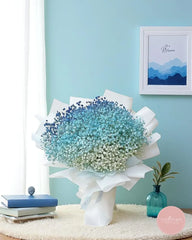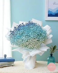 This dreamy arrangement features layers of baby’s breath in an enchanting gradient of white, sky blue, and deep indigo. Lightly wrapped in crisp white, this bouquet exudes calm and serenity—perfect for birthdays, graduations, or simply brightening someone’s day.