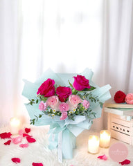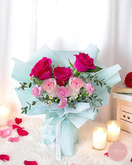 This charming bouquet showcases a harmonious blend of vibrant magenta and soft pink roses, complemented by delicate mini pink roses and lush greenery. Wrapped in elegant mint-green paper, it exudes sophistication and elegance, making it the perfect gift for any special occasion or to brighten someone's day. A refined floral gesture from your trusted florist in Singapore, complete with reliable flower delivery for all of life’s meaningful moments.