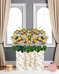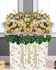 A grand and uplifting tribute, this triple condolence stand showcases a vibrant composition of yellow pompom chrysanthemums, bright orange sunflowers, and soft peach roses, surrounded by elegant monstera leaves and lush greens. The arrangement exudes both warmth and reverence, making it a meaningful gesture of respect and remembrance.
