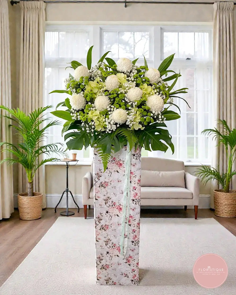 Suitable for wakes, funerals, and memorial services, this condolence flower stand conveys sympathy with grace and sensitivity. With reliable flower delivery in Singapore, we help you express your deepest condolences in a gentle and respectful way.