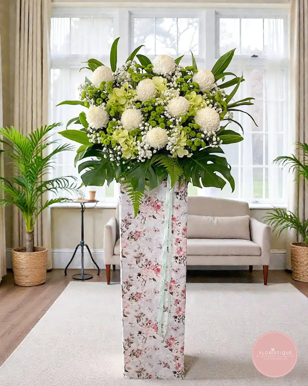 This serene condolence stand is thoughtfully arranged with soft white blooms and gentle green accents, symbolising peace, purity, and heartfelt remembrance. The rounded floral display is complemented by lush foliage, creating a calm and dignified presence that offers quiet comfort during moments of loss. Its clean, soothing palette reflects sincerity and respect, making it a meaningful tribute to honour a cherished life.