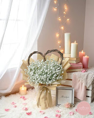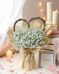 Simple, pure, and full of charm, this unique heart-shaped bouquet features fluffy white baby’s breath nestled within natural brown vine handles, wrapped in rustic kraft paper and tied with a soft beige ribbon. Its organic design exudes a timeless countryside elegance.