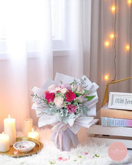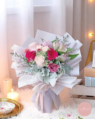 A graceful medley of romance and freshness, this bouquet showcases hot pink roses, soft blush carnations, lavender eustoma, and delicate chrysanthemum blooms, all nestled among frosted dusty miller leaves and gentle fillers. Elegantly wrapped in layers of white and pink, it’s a dreamy arrangement full of tender charm.