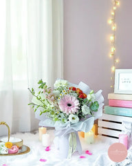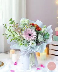 A delightful hand-tied creation featuring a soft pink gerbera daisy at its heart, surrounded by creamy white lisianthus, cheerful orange spray roses, and tiny chamomile blooms. Accents of pale pink stock and silvery eucalyptus lend an airy, romantic feel. Each stem is carefully selected for its freshness and vibrancy, creating a tender arrangement that soothes the soul and uplifts the spirit.