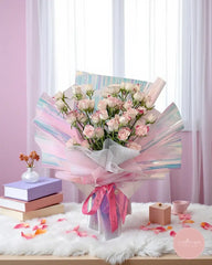 A delightful bouquet featuring clusters of soft pink spray roses accented with delicate white edges, elegantly wrapped in iridescent paper with a satin ribbon. Radiating charm and sweetness, this bouquet is a perfect expression of love, joy, and gentle affection.