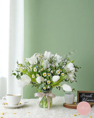 This elegant vase arrangement showcases pristine white tulips paired with cheerful chamomile blooms and lush greenery. The simplicity of the tulips exudes grace and purity, while the chamomile adds a soft, countryside charm to the ensemble.